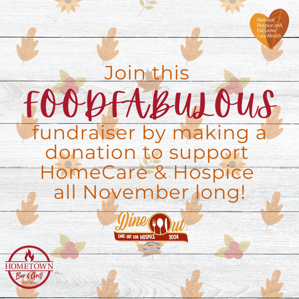Eat Local, Support Local! Hometown is proud to be a part of Dine Out for Hospice, a new fundraiser for HomeCare & Hospice. Throughout November, you can make a donation to support services at HomeCare & Hospice. Ask your server how!