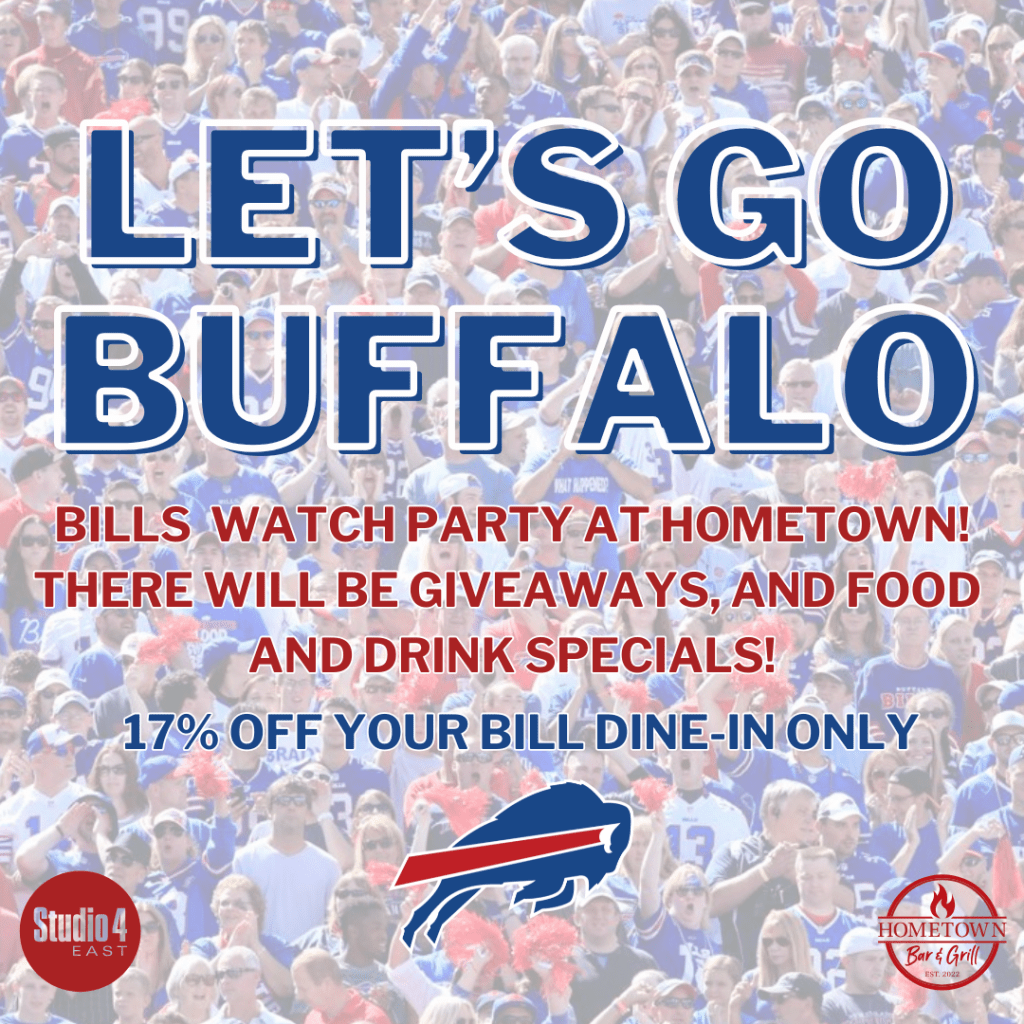 This Sunday we are hosting a Bills Watch Party! We are doing giveaways with Hometown Gift Cards and Studio 4 East Bills Merch! There will be food and drink specials, as well!