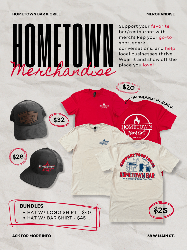 Hometown is now selling merchandise. Stop by soon to get a shirt or hat or BOTH!