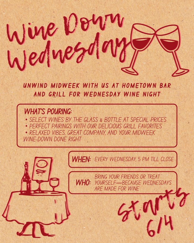 Starting June 4th, unwind midweek with us at Hometown Bar and Grill for Wednesday Wine Night!